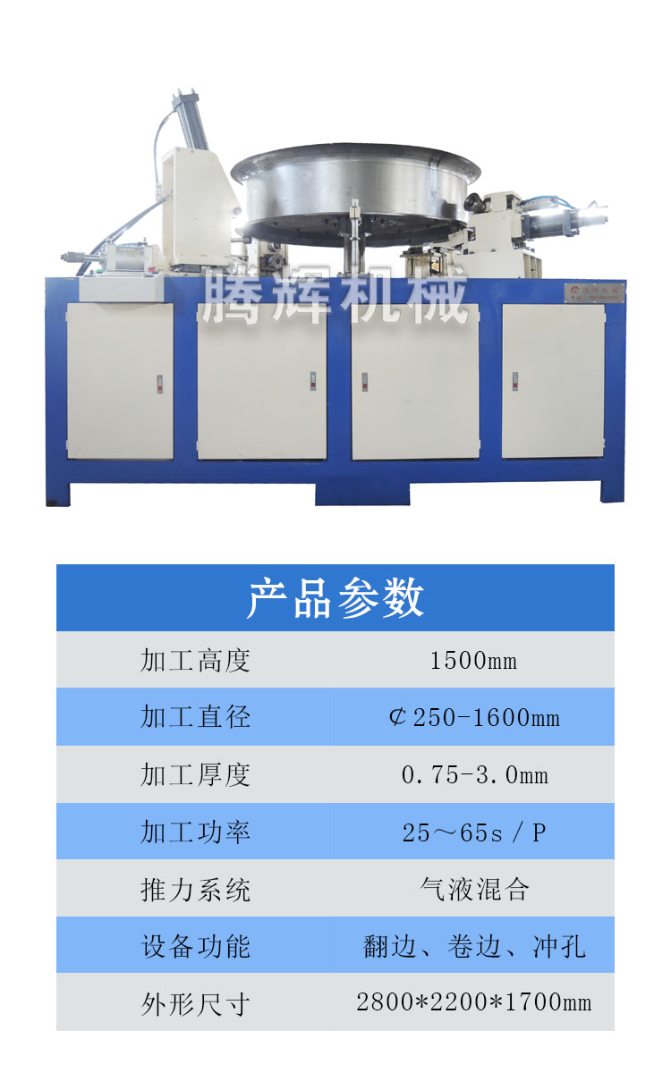 本文介绍的设备专用于轴流风机外壳的翻边冲孔机,加工直径范围可达1600mm,该机器操作简单,更换模具快捷,能耗低、效率高,一人操作即可完成风机翻边、卷边、打孔的制作。(公司根据客户需求,为客户量身定制适合的设备,欢迎新老客户咨询了解)
